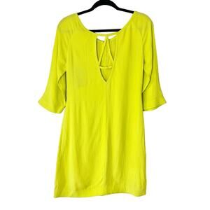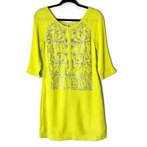 New with tags! Bright highlighter lime green shift dress. Three-quarter sleeves and knee length. Intricate beadwork on front with metal clasp front closure to n a scoop neck line. Fully lined with cutout detail on back neck. A spring and summer dress and a trending color!
