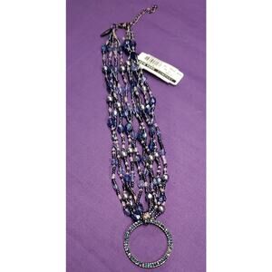 New York And Company Signed Necklace, Multistrand Seed Bead, Rhinestone Pendant w/tags. This is a gorgeous necklace with 5 strands of beads in multiple shades of blue, and some light pink. Some of the larger blue faceted beads have an iridescent Aurora Borealis coating. The necklace is about 16 inches long (8-inch drop) and it has a large Gunmetal tone and blue rhinestone circle pendant that drops another 1.375 inches. It has a dark gunmetal lobster clasp and 2-inch extender. Pre-owned and may have minor wear, still has original tag and is in excellent condition. Originally $29.50