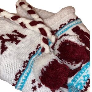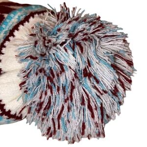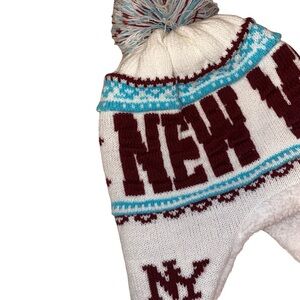 New York Beanie Trapper Hat w/ Ear Flaps, Braided Ties and Pom Poms WHT-BLU-BUR