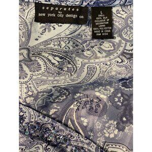 ITEM: New York City Design L Blue Paisley Silk Beaded V-Neck Long Bell Sleeve Top