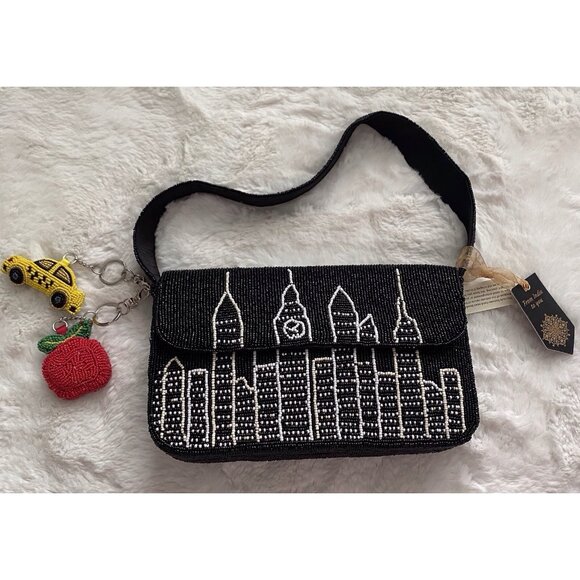 New York City NYC Skyline Skyscrapers Beaded Shoulder Bag with Charms Taxi Cab And Apple Made In India Viral NEW