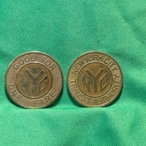 NEW YORK CITY TRANSIT AUTHORITY 2 SUBWAY TRANSIT TOKENs. 1980S. OWN A PIECE OF NEW YORK CITY HISTORY YOU CAN FEEL #204334198564