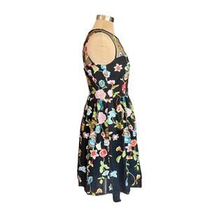 New York & Co Black Mesh Allover Floral Embroidered Dress Sz 6 Boho Prom Party. Sleeveless. Fit and flare styling. Bodice is satin with all over multicolor floral embroidery. Yoke and skirt are embroidered sheer mesh. There is an underlying tulle layer and lining layer to the skirt. Back has a zipper with large keyhole opening with button at neck. New with tag. Knockout fun!