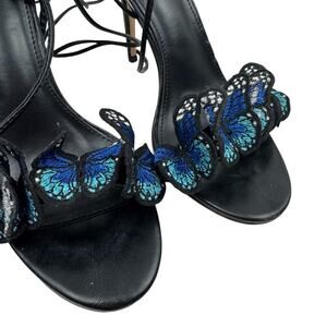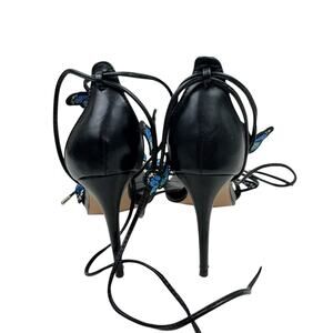 Black faux leather, 3-D butterflies, open toe, 4" heel, wrap-around ankle laces, size 7.5.
