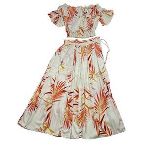 This Eva Mendes X New York & Co women's Skirt Set makes a statement due to it's pullover off the shoulder cropped ruffle blouse with keyhole tie detail, button side maxi skirt with tie detail, pockets, unlined and cream/orange palm design.