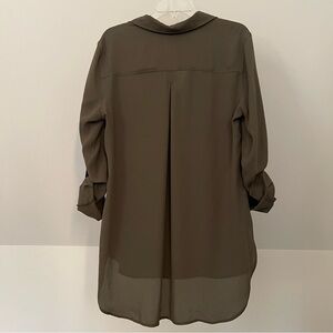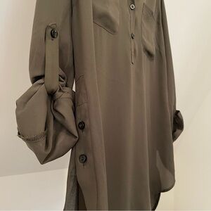 Beautiful olive green tunic blouse with side hem button detail, button v-neck collar with 3/4 roll tab sleeves. Two chest pocket, shirttail hem.