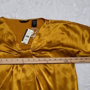 New with tags. Beautiful mustard gold satin fabric. V-neckline. Drop shoulder, short puff sleeves with button cuffs. Draped detail in front. Size per tag: XS (Extra Small). Fabric: 98% Polyester/ 2% Spandex. Size per tag does not guarantee desired fit, please see pictures for measurements.