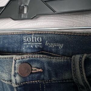 This New York & Co Soho Jean Leggings in women's size 6 feature a solid blue color in a denim fabric wash with a medium distress level. The jeggings have a zip closure, belt loops, and a 5-pocket design. Made from a cotton blend material with stretch, these regular-fit leggings are machine washable and are part of the NY&Co Soho product line. Perfect for everyday wear, these jeggings offer comfort and style with a classic denim look.