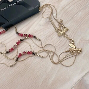 Five layers of carrying chain with assorted pink and purple colored beads will dress up any neckline. Lobster closure.