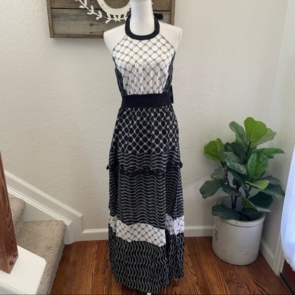 New York & Co black white halter maxi dress cotton size L NWT. Stretchy at waist. 100% cotton. Unlined. Pom details on skirt. Perfect vacation dress for beach, date night, cruise, pool. No trades
