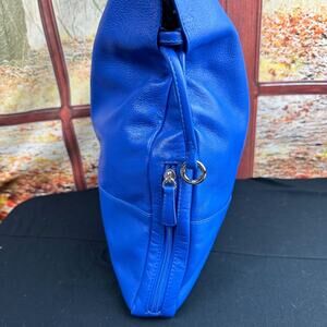 Add a pop of color to your wardrobe with this stunning cobalt blue leather tote bag. This roomy tote is 12"long, 13" tall and 2" wide.