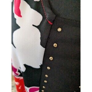 This New York Collection top is a vibrant and artsy blouse featuring an abstract deep pink and black floral pattern with studded accents. The neckline is a scoop neck and the closure is a pullover style, making it easy to wear. With 3/4 sleeves and a lightweight knit and chiffon fabric blend, it is suitable for all seasons and occasions ranging from parties to business wear. The blouse is designed in a regular fit for women size L, offering a classic and colorful look with a touch of metal-themed style. Very flattering cut! Worn once or twice!