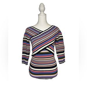 7th Avenue Design Studio New York & Company stylish statement piece vibrant multicolor striped pattern flattering V-neckline work job interview business meeting office daily everyday casual occasion 3/4 sleeves comfortable pullover closure elegant nylon rayon durable lightweight pre-owned great condition regular fit basic designer blouse top size xs extra small for women.