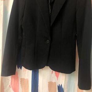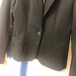 • Other information: Black suit jacket blazer. One button closure at the front of the jacket. Pretty stitching accents. Lined. Collar, side and back slits and shoulder pads present. No button closure at the wrists.