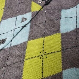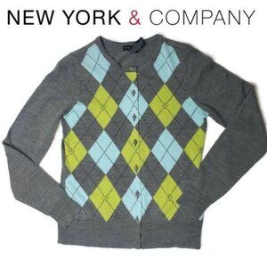New York & Company Argyle Cardigan Sweater Gray green Rhinestone Accent button S