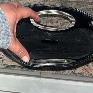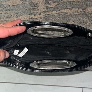 Gorgeous classy hand held bag, black on both sides. Bold silver hardware, signature cloth interior, zip interior pocket