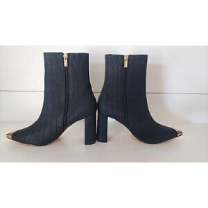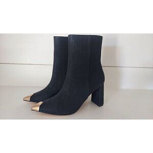 Elegant black ankle boots with striking gold toe caps. Perfect for a chic look.