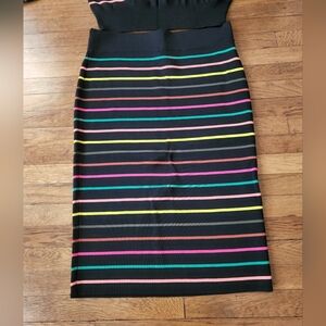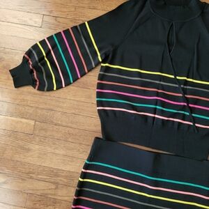 Chic long sleeve dress with vibrant stripes. Features black, pink, yellow, and green hues. Ideal for stylish outings.