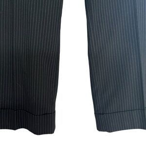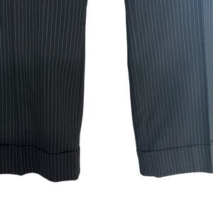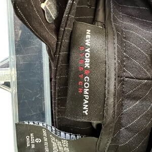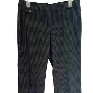 These elegant black trousers from New York & Company feature a subtle pinstripe pattern, offering a sophisticated touch to your professional wardrobe. Crafted with a structured fabric, they provide a polished look suitable for office or formal occasions. The classic straight-leg cut ensures a timeless style that pairs well with various tops and shoes.