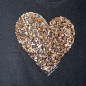 New York & Company – Black U-Neck T-Shirt with Large Gold Sequined Heart (Size XL), GUC. Show your love with this short-sleeved black U-neck t-shirt that features a large gold sequined heart, front and center. Comfortable and soft, the sparkle brings extra pizazz to the everyday black tee and jeans look.