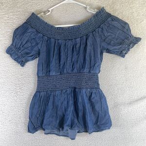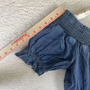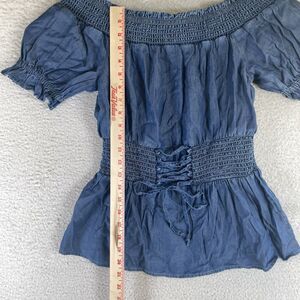 Elevate your wardrobe with this stunning New York & Company corset blouse in a beautiful blue denim style. This blouse is perfect for any occasion, whether you're traveling, going to a party, or just dressing casually. The off-the-shoulder neckline and short sleeves add a touch of elegance to the blouse, while the stretchy lyocell material ensures a comfortable fit.