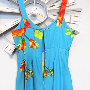 Vibrant blue midi dress with bold floral print. Features red and orange flowers. Sleeveless design with a fitted bodice.