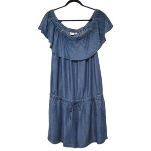 New York & Company Chambray Off-the- Shoulder Ruffle Romper, XL, Pre-owned
