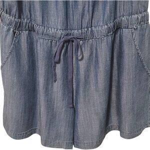 This romper from New York and Company features an off-the-shoulder design with a ruffle detail at the top, a drawstring waist, and side pockets. It's made from chambray fabric and has a casual, summery style, perfect for warm weather.