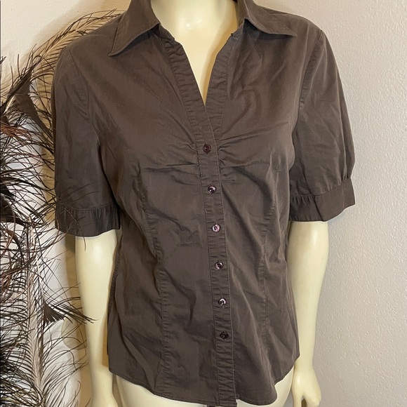 Chic dark brown button-down shirt. Features short sleeves and a classic collar. Ideal for versatile styling.
