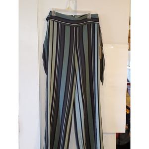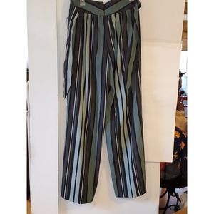 Wide legged pants by Eva Mendes For New York & Company. These have a striped pattern and zip up the back with ties at the waist. They still have the tags attached. 97% polyester and 3% spandex this pair of flowy loose pants are trendy and versatile. Women's size S . Waist measures 15" from side to side with a 32" inseam.