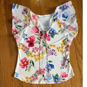 New York & Company Floral Blouse, V Tie Neck, Flutter Sleeve, size Medium