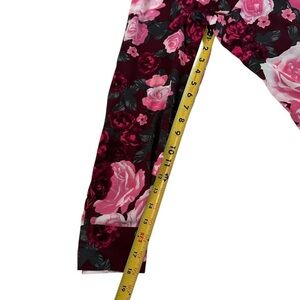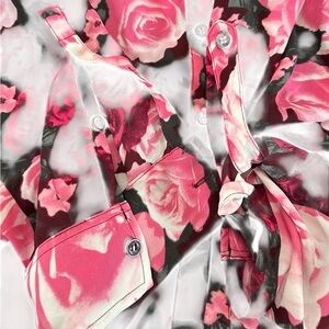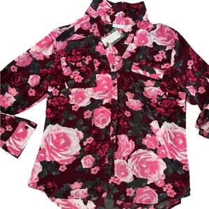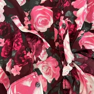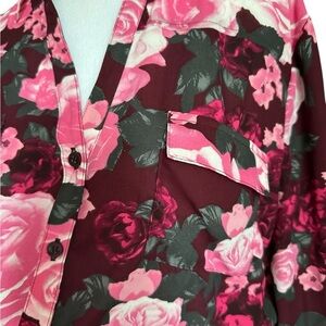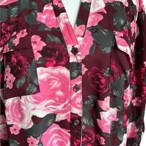 New York & Company Floral Pink Burgundy Roll Tab Sleeve Floral Button Down XL