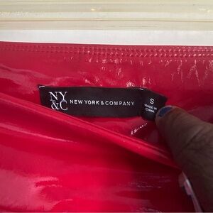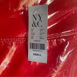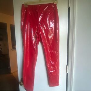 Glossy red pants with a sleek finish. Perfect for a bold look.