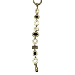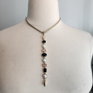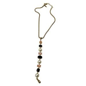 Sleek and modern, this gold-tone necklace from New York & Company features a flexible snake chain and a symmetrical arrangement of geometric accents in blush, black, and pearl tones. The fluid chain adds a polished finish, ideal for layering or statement wear.