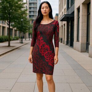 New York & Company gothic-inspired long sleeve midi dress in black with bold red baroque scroll floral print. Perfect for whimsigoth, 90s revival, witchy fashion, dark academia, cottagecore goth, or grunge aesthetics. Stretch knit fabric with scoop neckline, fitted silhouette, and pull-on style. Flattering and unique statement piece for holidays, office, or casual wear.