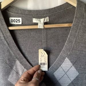 Elegant gray V-neck with classic argyle pattern. Perfect for layering.