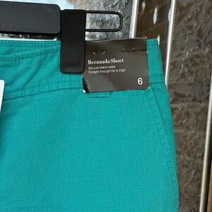 These knee-length Bermuda shorts from New York & Company feature a sleek flat front design and are crafted from a smooth, structured fabric. The vibrant green color adds a fresh, summery touch, making them perfect for casual outings.
