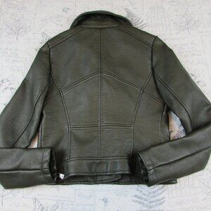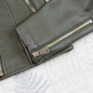 measured laying flat across the frontshoulder to shoulder:15"pit to pit:18.5"length:19"sleeve:25"New York & Company Green Faux Leather Moto Jacket Women’s Silver Zip Biker XS