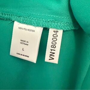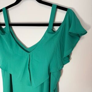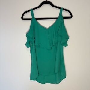This vibrant green blouse from New York & Company features elegant flutter sleeves and a ruffled design, making it a standout piece. Crafted from a light, flowing fabric, it offers a chic and comfortable fit perfect for both casual and semi-dressy occasions.