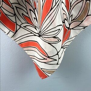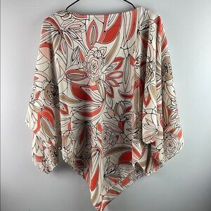 Stylish floral poncho top with vibrant orange and cream colors. Classy, dressy, fun artistic design, good for business wear and great with jeans