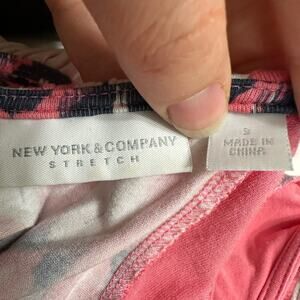 New York and Company brand dress. Sleeveless style with gathered high neckline & spaghetti straps. Keyhole in back with button and loop. Maxi length. Very slimming/ elongating colorblock look that has salmon pink sides & wide geometric panel down back & front. Pattern is pink, navy, white, and tan. Very soft rayon spandex material. Slit down the one side. Machine wash gentle inside out. Flat dry. Great used condition with minor pilling. Size small but could fit a medium as well. Feel free to make a reasonable offer. Or check out my other items and message me for a great bundle deal!