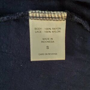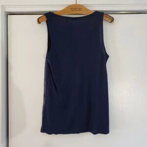 Introducing our Women's New York & Company Lace Overlay Tank Top, a stylish addition to your wardrobe. This tank top is in excellent used condition, with no rips or stains, ensuring a clean and polished look. Designed by New York & Company, a trusted brand known for its quality and style, this tank top is perfect for any occasion. The navy color adds a touch of sophistication, while the lace overlay adds a feminine and elegant touch. Made from 100% Rayon for a comfortable fit, the lace is crafted from 100% Nylon, adding a delicate and intricate detail. With measurements of 17.5" from armpit to armpit and 23.5" from shoulder strap to the bottom of the top, this tank top is available in a size small. Whether you're dressing up for a night out or keeping it casual, this Women's New York & Company Lace Overlay Tank Top is a versatile and stylish choice.