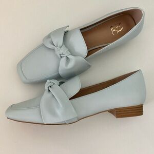 Brand new with box and packaging pastel blue loafers with a beautiful knotted bow design. Elegant piping trim and a moc toe and slip-on style. Unbeatable comfort with a soft, cushioned insole. In color Pastel Blue.