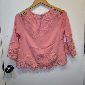 New York & Company Pink Bell Sleeve Blouse with Tie Front Lace Hem Size Small