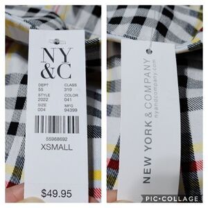 New York & Company yellow, black, red and white plaid ankle length stretch pants.