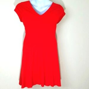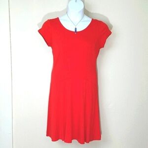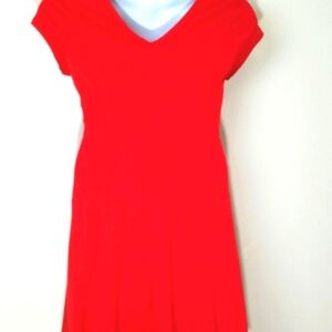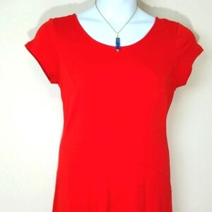 New York & Company women’s size medium midi dress in vibrant red. Made of 100% cotton jersey stretch fabric with a fitted bodice and full A-line skirt. Features cap sleeves, scoop neckline, and comfortable fit-and-flare silhouette. Measures 19.5" armpit to armpit, 37" length. Excellent used condition, like new without tags.