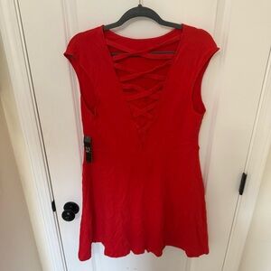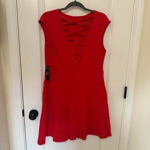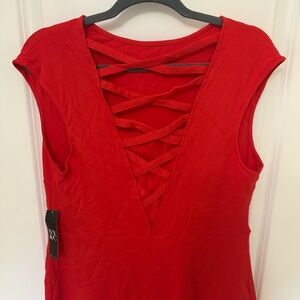 Elegant red midi dress with crisscross back design. Sleeveless and stylish. Perfect for any occasion. NWT, Never Worn