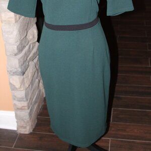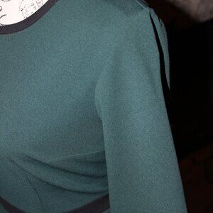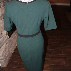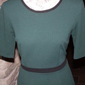 New York & Company Stretch line. Dark green, short sleeve, round neck dress. Black piping accent circles the entire neck and waist. Covered zipper. Fully lined. 95% polyester. 5% spandex. Lining 100% polyester. 39 inches from shoulder to hem. Can be hand washed. Gently worn and has only been dry cleaned. Small fits a size 6.