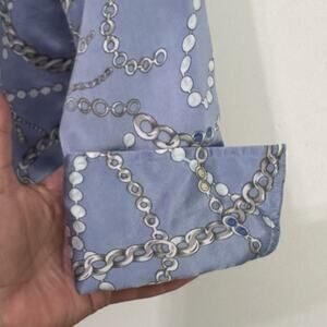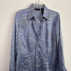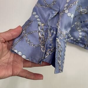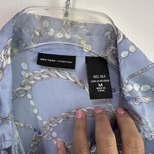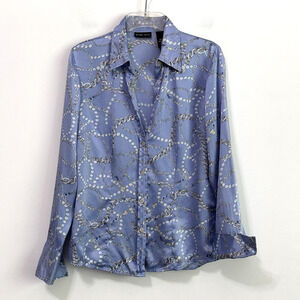 New York & Company Silk Blouse M V Neck Button Front Chains Pearls French Cuff