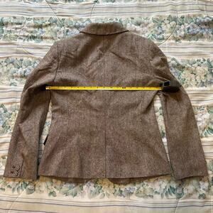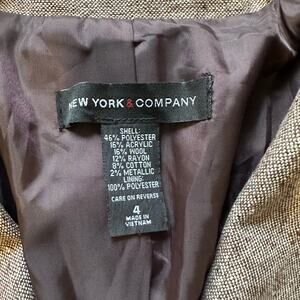 Introducing a beautiful blazer from New York & Company, perfect for any fashion-savvy woman. This single button closure blazer features a brown color and is made of durable polyester material, making it perfect for any occasion. It is a size 4 and falls under the category of coats, jackets & vests in women's clothing. The blazer is designed with a basic jacket style, making it versatile and easy to match with any outfit. Whether you're dressing up for a formal event or simply going out for a casual day, this blazer is a must-have in your wardrobe.